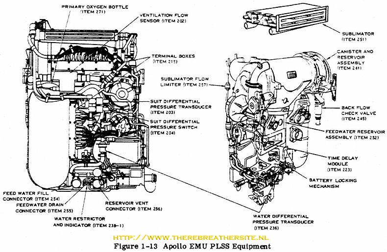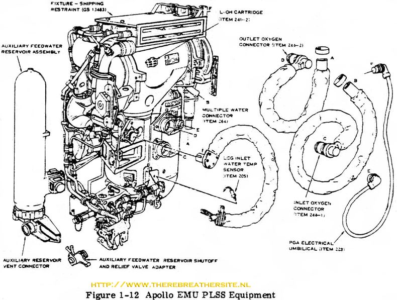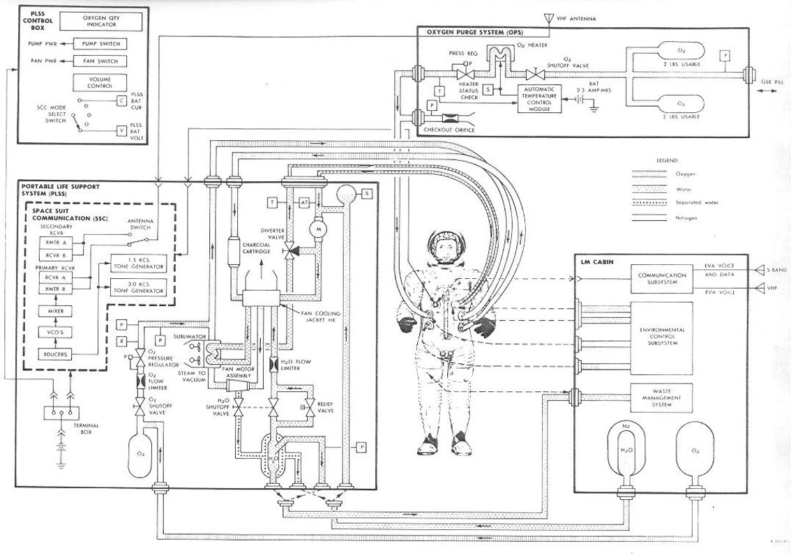 The PLSS includes oxygen bottles, water storage tanks, a