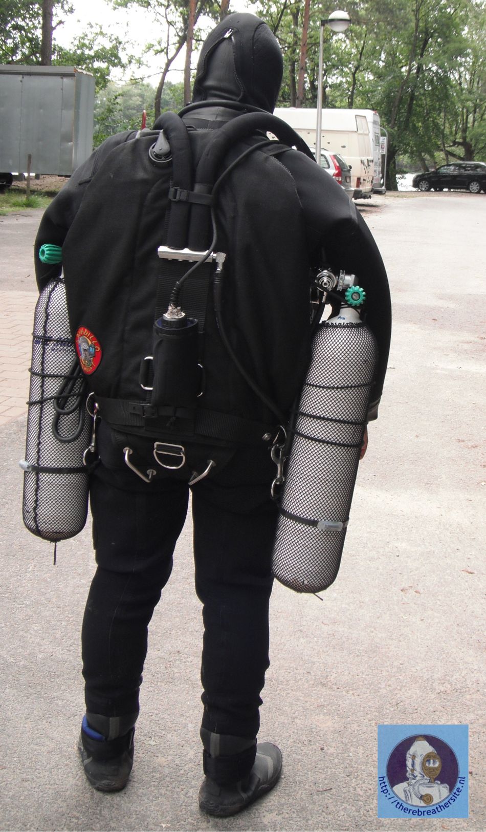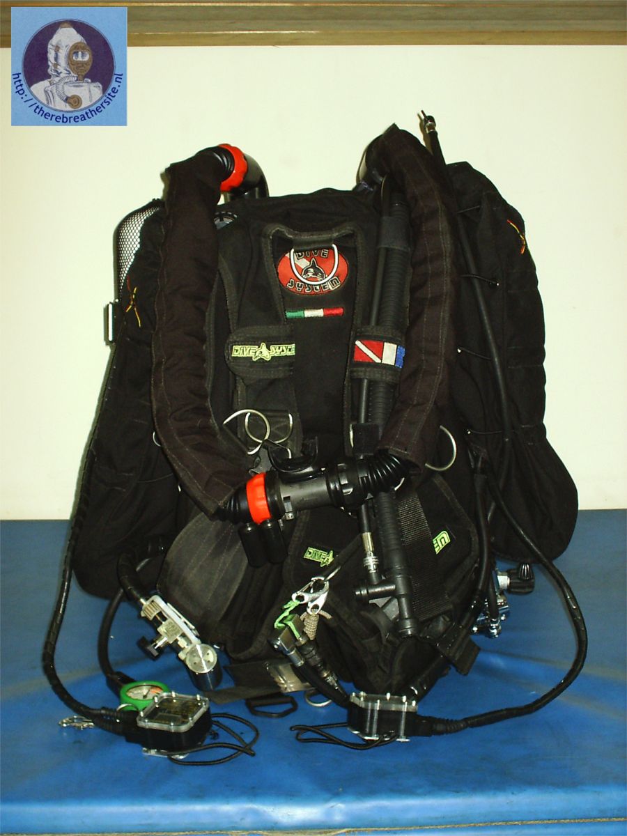 Overzicht van de achterkant van de rebreather, met aan de linkerkant de diluent, de rechterkant de zuurstof en van onder een 2L of 5L 200 bar bail-out fles. De O2 fles is 4L 200 bar en de diluent fles is 4L 200 bar. De wing is van het merk ED aangepaste voor Dräger Dolphin. De eerste trap van diluent fles is van het merk poseidon. Onderaan is het draagstel voor de fles een beetje verlengd zodat ze niet raakt met de andere flessen.