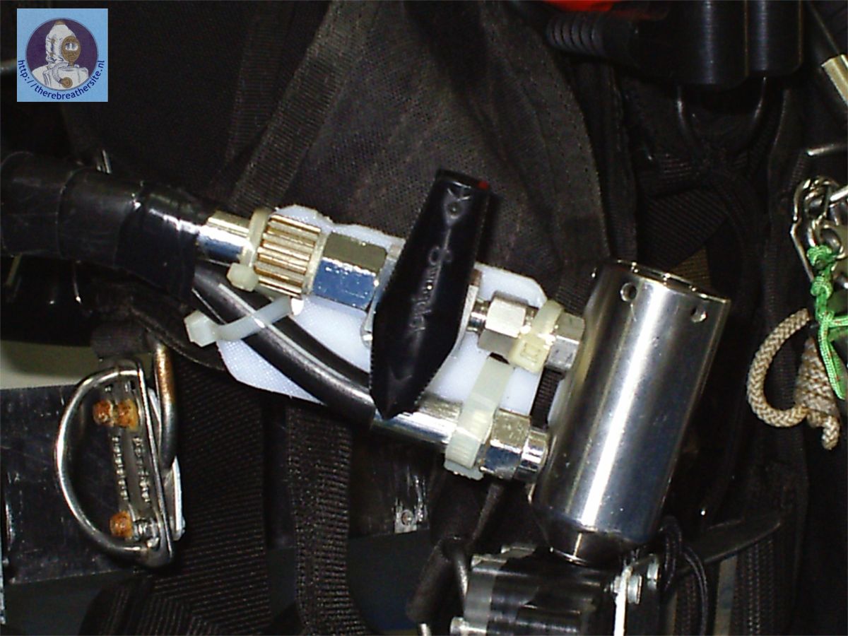 Een extra veiligheid is een free flow control valve voor het diluent gas om te kunnen spoelen als er teveel O2 in het systeem is. Hangt aan de linker kant vooraan.