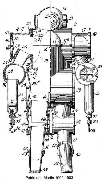 The following year, an improved dress was patented by the same inventor in conjunction with Martin. In this, the friction of the joints was to be obviated by mounting them on ball-bearings. Neither in this nor the previous patent is any clear indication given of how it is proposed to keep the joints watertight, yet the rubber envelope presumably intended to serve this purpose with the 1902 dress is now discarded. Possibly Messrs. Petrie and Martin determined to put up with a certain amount of leakage as unavoidable, for in the following year we find them taking out a patent for a pump designed to expel water from armoured diving-dresses. It is operated by compressed air, and is shown in two alternative locations—in the small of the diver's back and on the calf of his leg. |