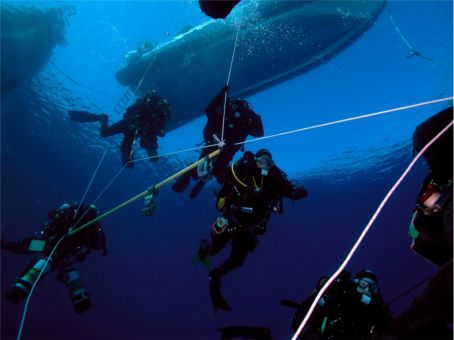 technical divers' doken naar het op 45 meter diepte gelegen wrak. Op deze