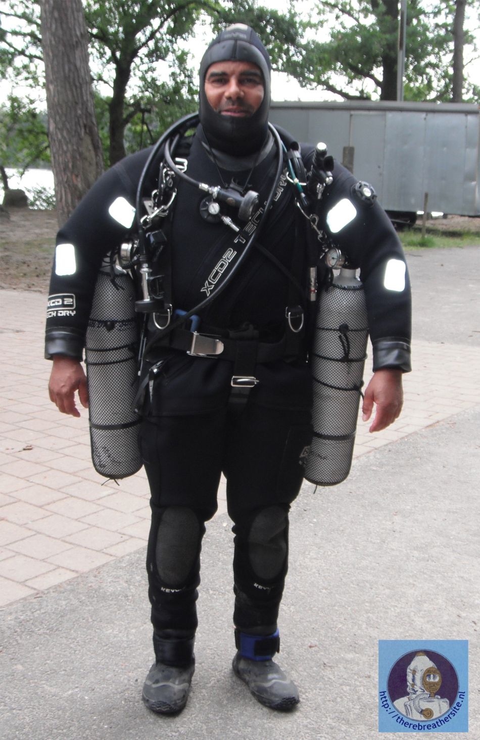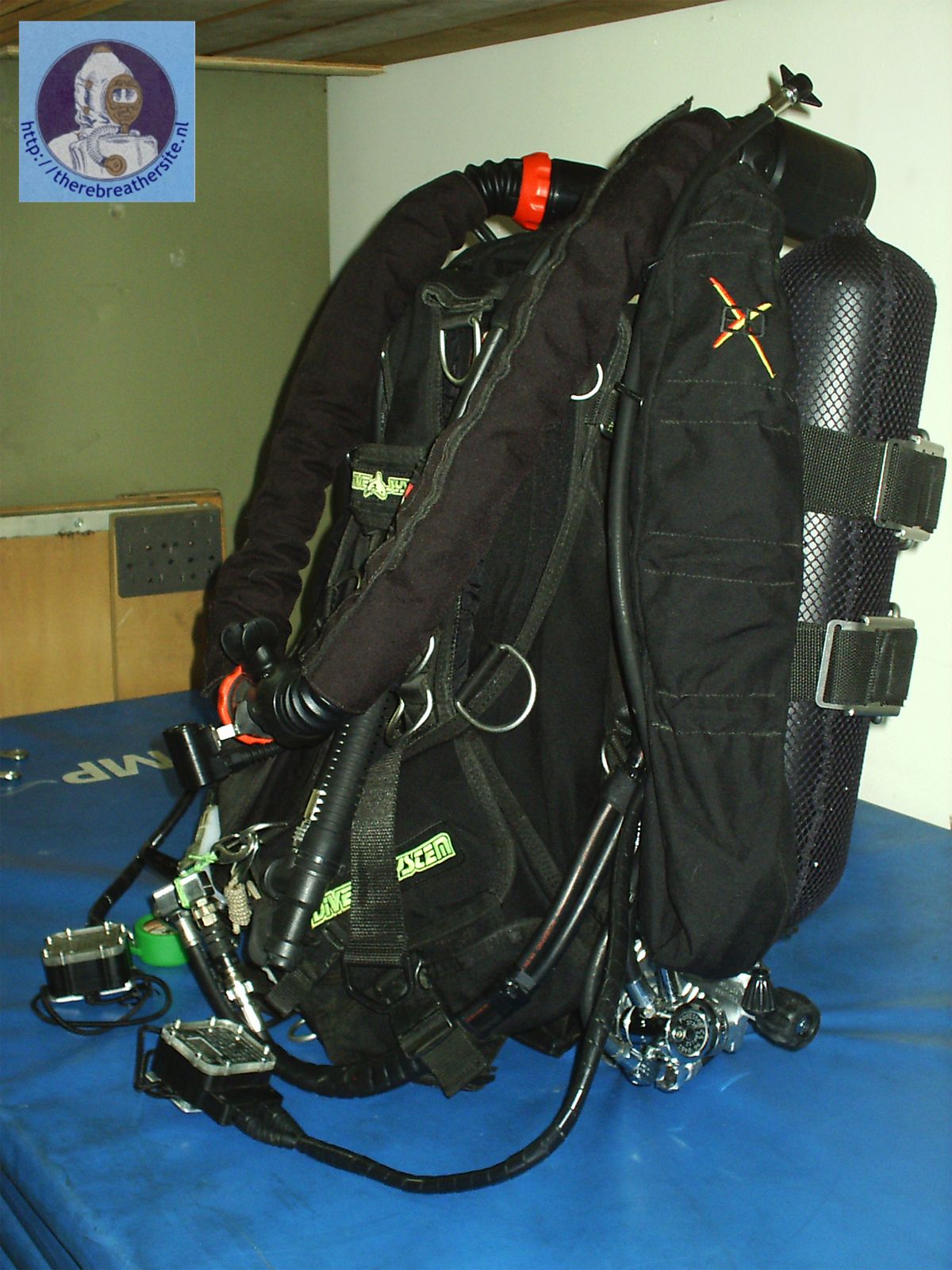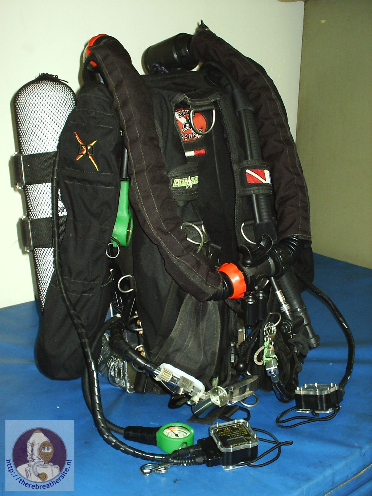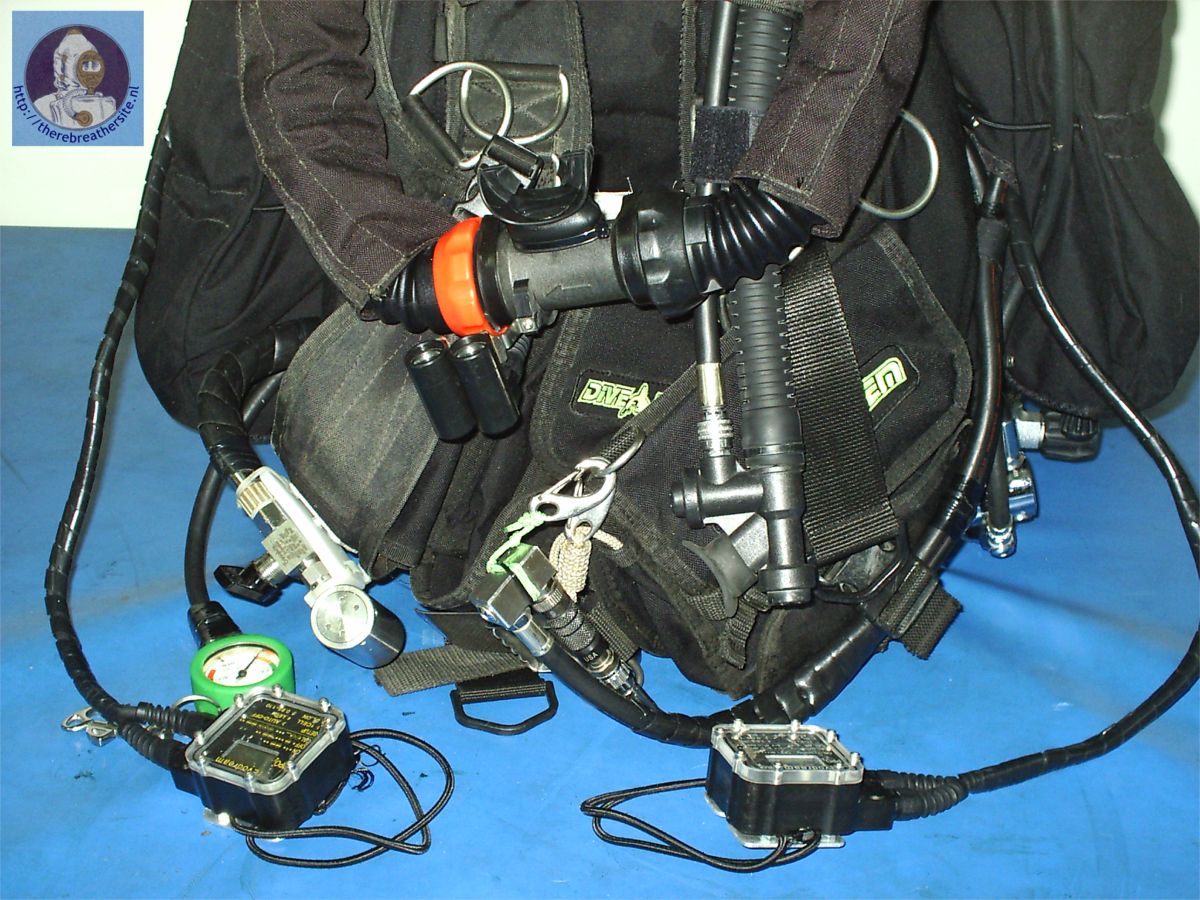 Overzicht van de achterkant van de rebreather, met aan de linkerkant de diluent, de rechterkant de zuurstof en van onder een 2L of 5L 200 bar bail-out fles. De O2 fles is 4L 200 bar en de diluent fles is 4L 200 bar. De wing is van het merk ED aangepaste voor Dräger Dolphin. De eerste trap van diluent fles is van het merk poseidon. Onderaan is het draagstel voor de fles een beetje verlengd zodat ze niet raakt met de andere flessen.