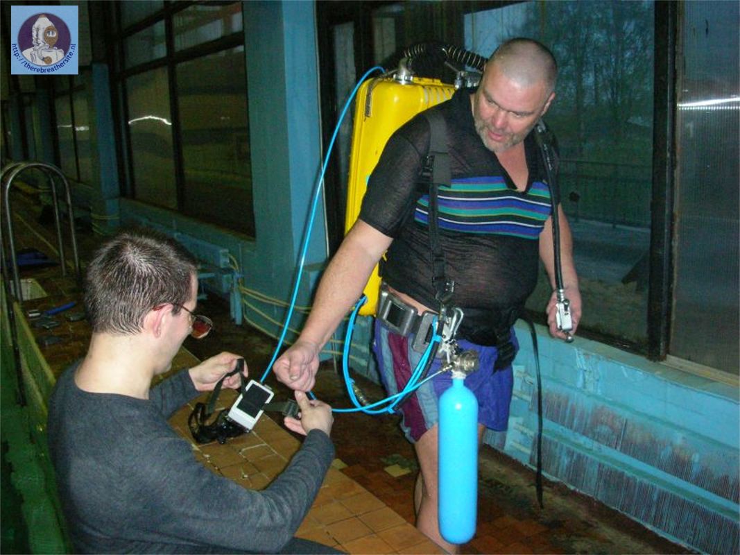 the oxygen bypass and air manometer on the right shoulder belt, and depth
