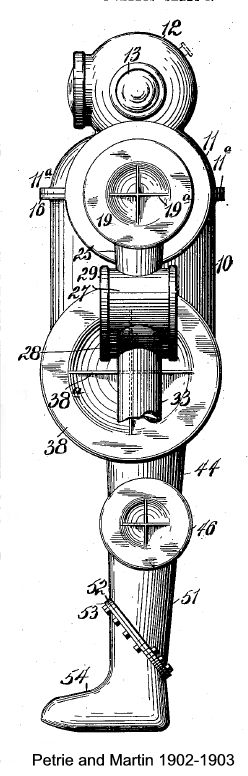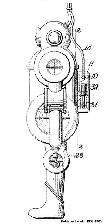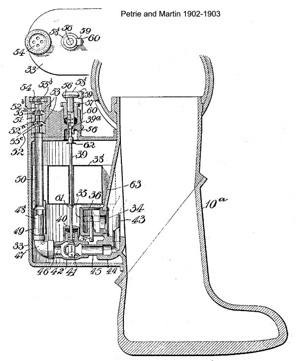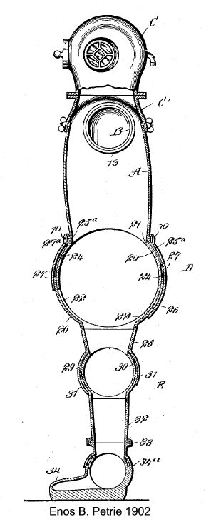 The following year, an improved dress was patented by the same inventor in conjunction with Martin. In this, the friction of the joints was to be obviated by mounting them on ball-bearings. Neither in this nor the previous patent is any clear indication given of how it is proposed to keep the joints watertight, yet the rubber envelope presumably intended to serve this purpose with the 1902 dress is now discarded. Possibly Messrs. Petrie and Martin determined to put up with a certain amount of leakage as unavoidable, for in the following year we find them taking out a patent for a pump designed to expel water from armoured diving-dresses. It is operated by compressed air, and is shown in two alternative locations—in the small of the diver's back and on the calf of his leg. |