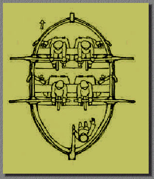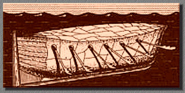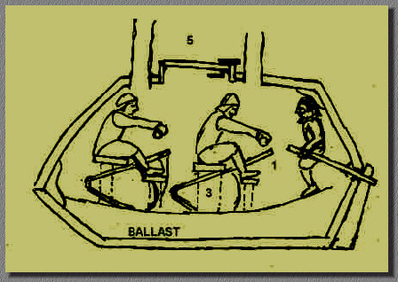 door roeiers die hun roeispanen door een lederen afdichting staken. Er