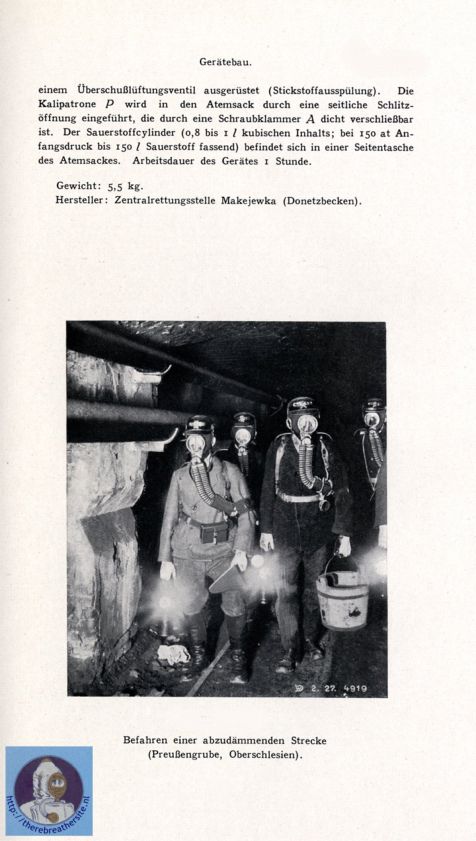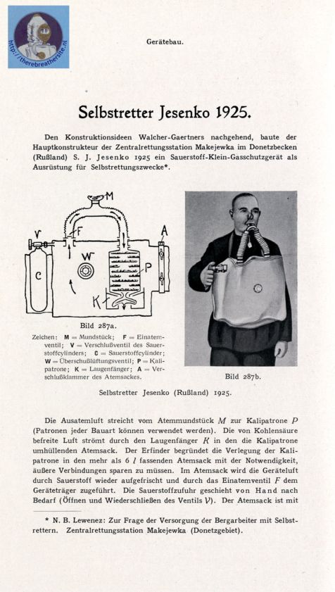 | Following the ideas of Walcher-Gaertners Mr. S. J. Jesenko build a small oxygen breathing apparatus in 1925 for the use in Makejewka in the Donetz Russia. |
